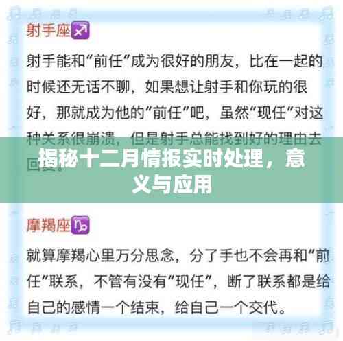 本文将探讨情报实时处理的概念,特别是在十二月的背景下,分析其重要性、应用场景以及实际应用中所面临的挑战,通过深入了解情报实时处理的核心意义,我们将更好地理解其在国家安全、商业智能等领域中的价值。
