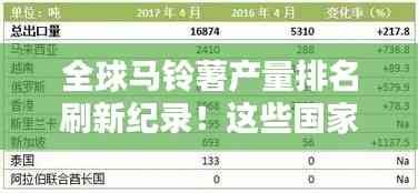 马铃薯是全球重要的农作物之一,其产量和品质是衡量一个国家农业发展水平的重要指标之一,随着全球经济的发展和人口的增长,马铃薯产业逐渐壮大,各国之间的马铃薯产量竞争也日益激烈,本文将介绍世界马铃薯产量纪录排名,探讨马铃薯产业的发展现状及未来趋势。