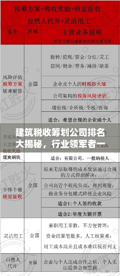 在现代社会,税收筹划已成为企业与个人财务管理的重要组成部分,特别是在建筑行业,税收筹划的重要性尤为突出,随着市场竞争的加剧,建筑公司越来越需要专业的税收筹划服务来确保其财务稳健并降低风险,本文将探讨建筑税收筹划公司的排名,揭示行业内的佼佼者。
